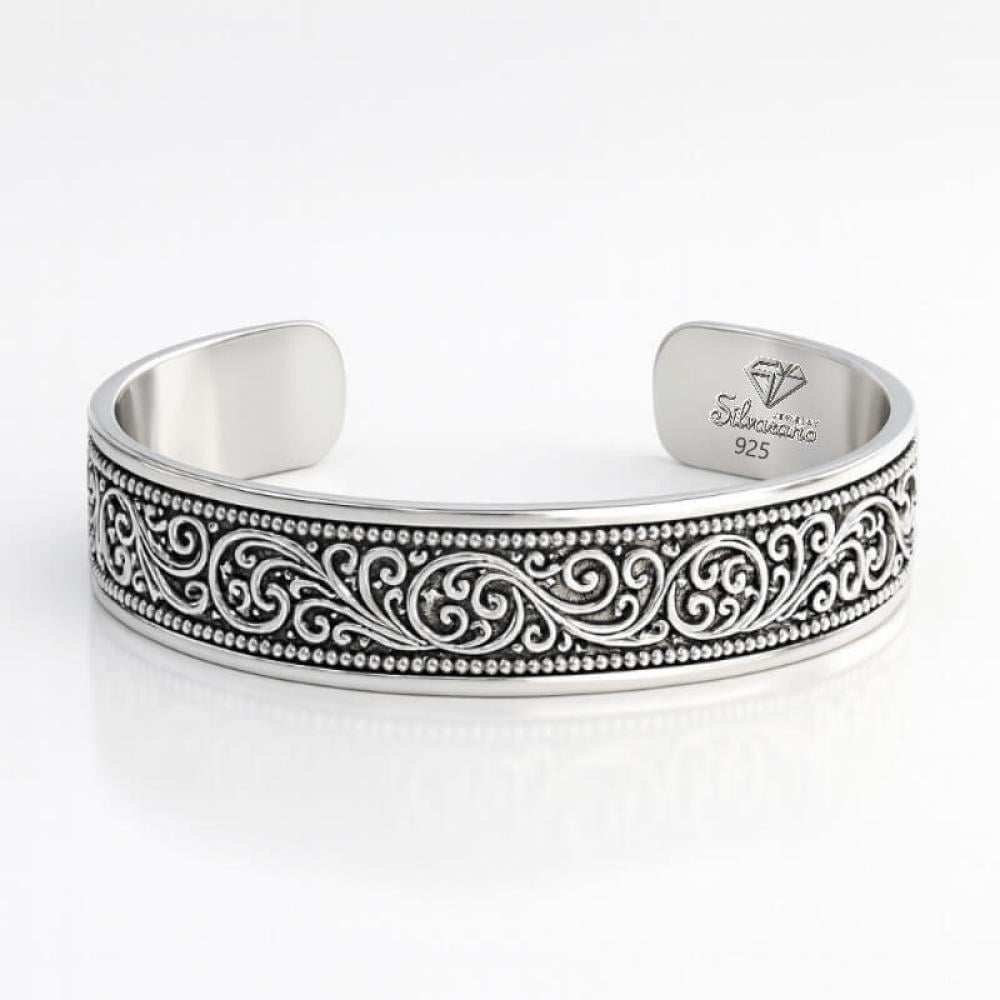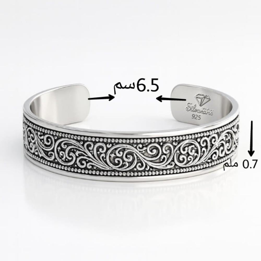 ارتقِ بإطلالتك مع سوار فضة 925 بتصميم كَفّ مفتوح ونقوش عربية متقنة بتأثير مؤكسَد يبرز التفاصيل الدقيقة. حواف ناعمة ولمعة فضية فاخرة تمنح السوار حضورًا عصريًا يليق بالرجال والنساء. مناسب للاستخدام اليومي والمناسبات، سهل التعديل على المقاس ويُنسّق بسلاسة مع الخواتم والأساور الأخرى من Silvarano. خيار مثالي لهدية أنيقة تدوم.